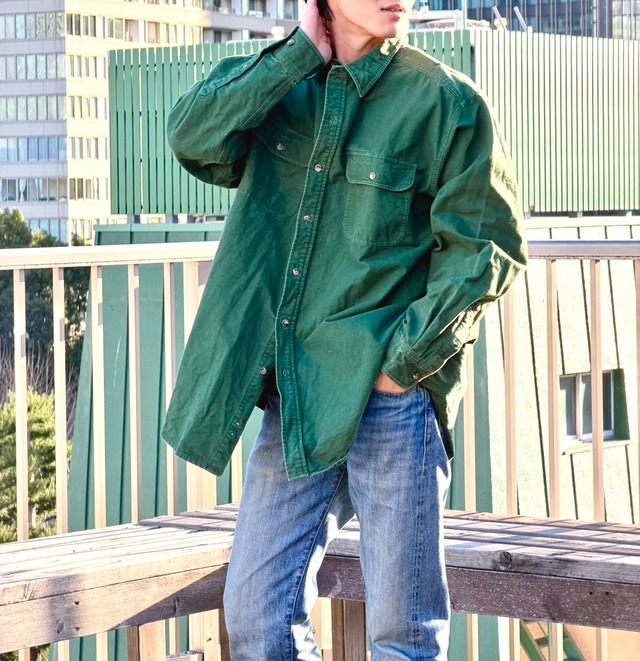 ○古着 着回し自在のオーバーサイズシャツ! OPEN記念プライス ¥2,980 → ¥2,480 ※予告なく終了する場合がございます。 サイズ XLT 着丈80cm 袖丈62cm 肩幅50cm ●素材● 綿 100% ●カラー● グリーン ●商品状態● ・中古品(リユース) ・目立つ汚れやダメージなし ・ホームクリーニング済み ■デザイン 深みのあるグリーンカラーが印象的なワークシャツ。フロントのフラップ付きポケットが程よい無骨さを演出します。 ビッグサイズかつ着丈はやや長めで、ラフに着ても雰囲気が出る一枚。 古着ならではのフェード感があり、こなれた表情に仕上がっています。 ■コーディネート 着丈が長めのため、羽織としての着用がおすすめ。インナーにTシャツを合わせて前を開ければ、ライトアウター感覚で活躍します。 太めのデニムやワークパンツと合わせた、無骨な古着スタイルと相性◎ タックインしてシルエットに変化をつけるのもおすすめです。 ■着用モデル 身長177cm 体重63kg --- *撮影環境やご覧のモニター環境により、実際の色味と異なって見える場合がございます。 状態をご了承の上、ご購入をお願いいたします。
