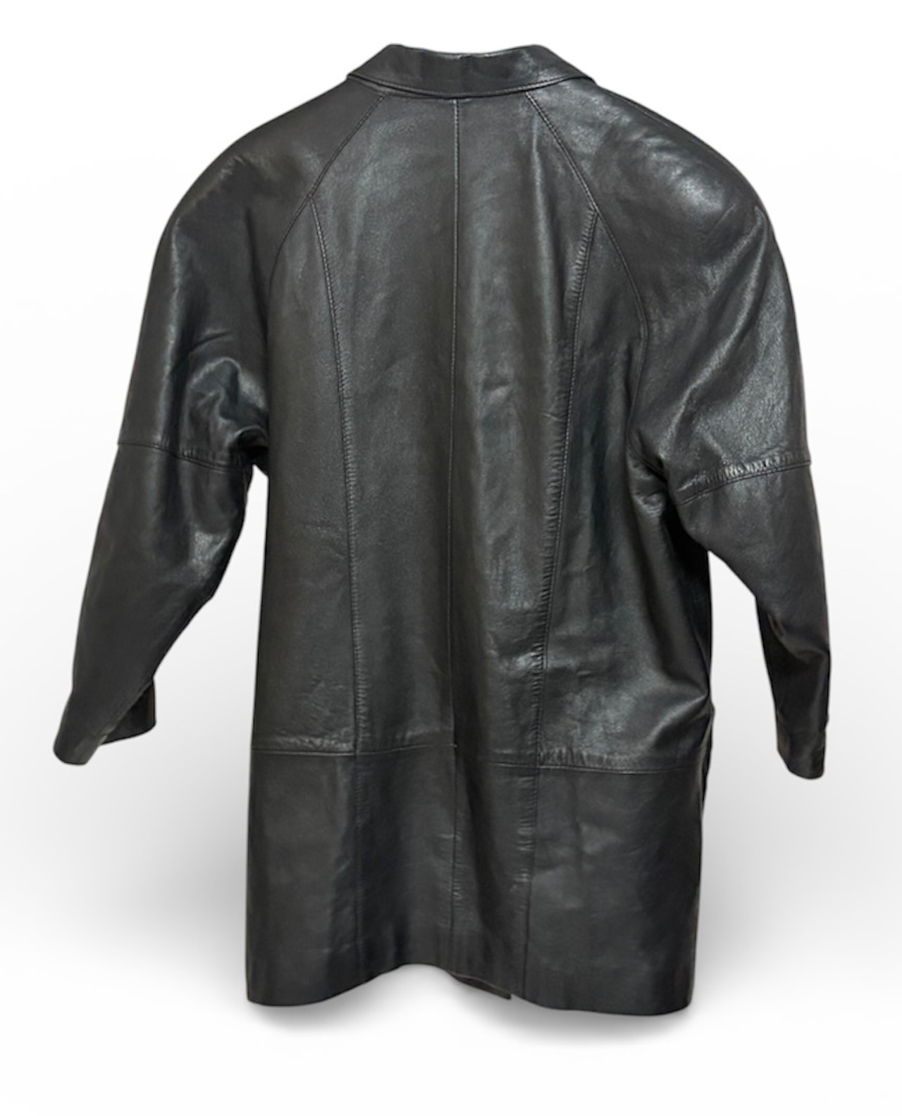 使い込まれたレザー特有のシワ感とツヤがあり、シンプルながらも存在感のある一着。