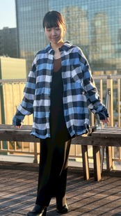 女性がオーバーサイズで着ると、抜け感のあるシルエットになります。前を閉めても羽織でも使える、着回しのきく一枚です。