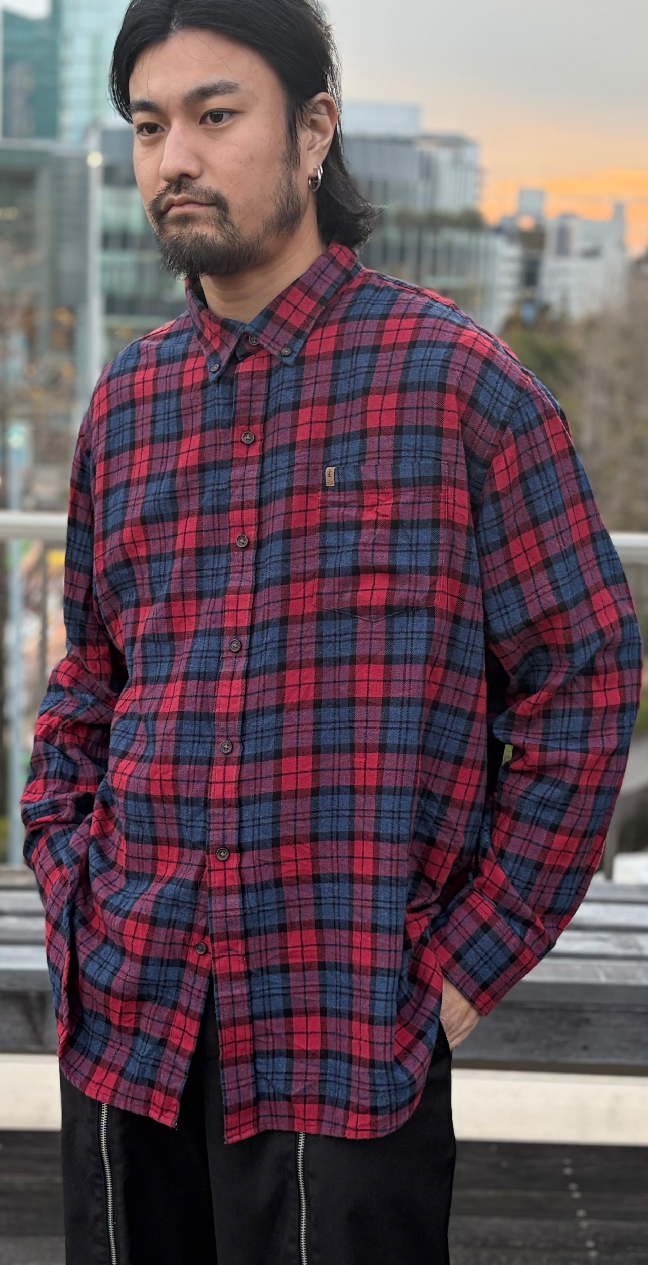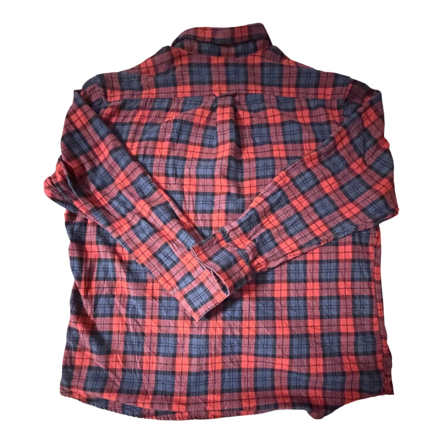赤とブラックの王道チェックで、古着らしい雰囲気のある一枚。