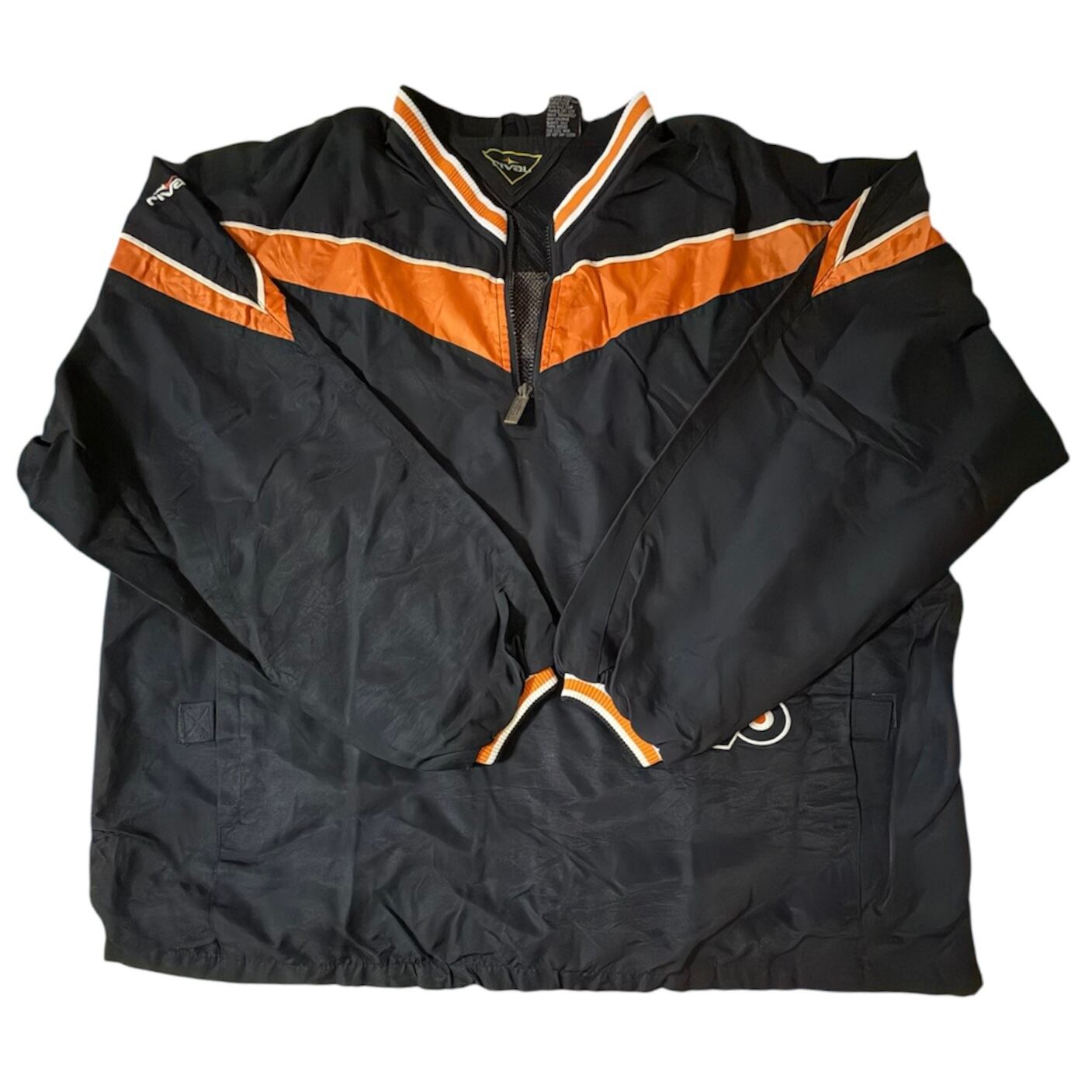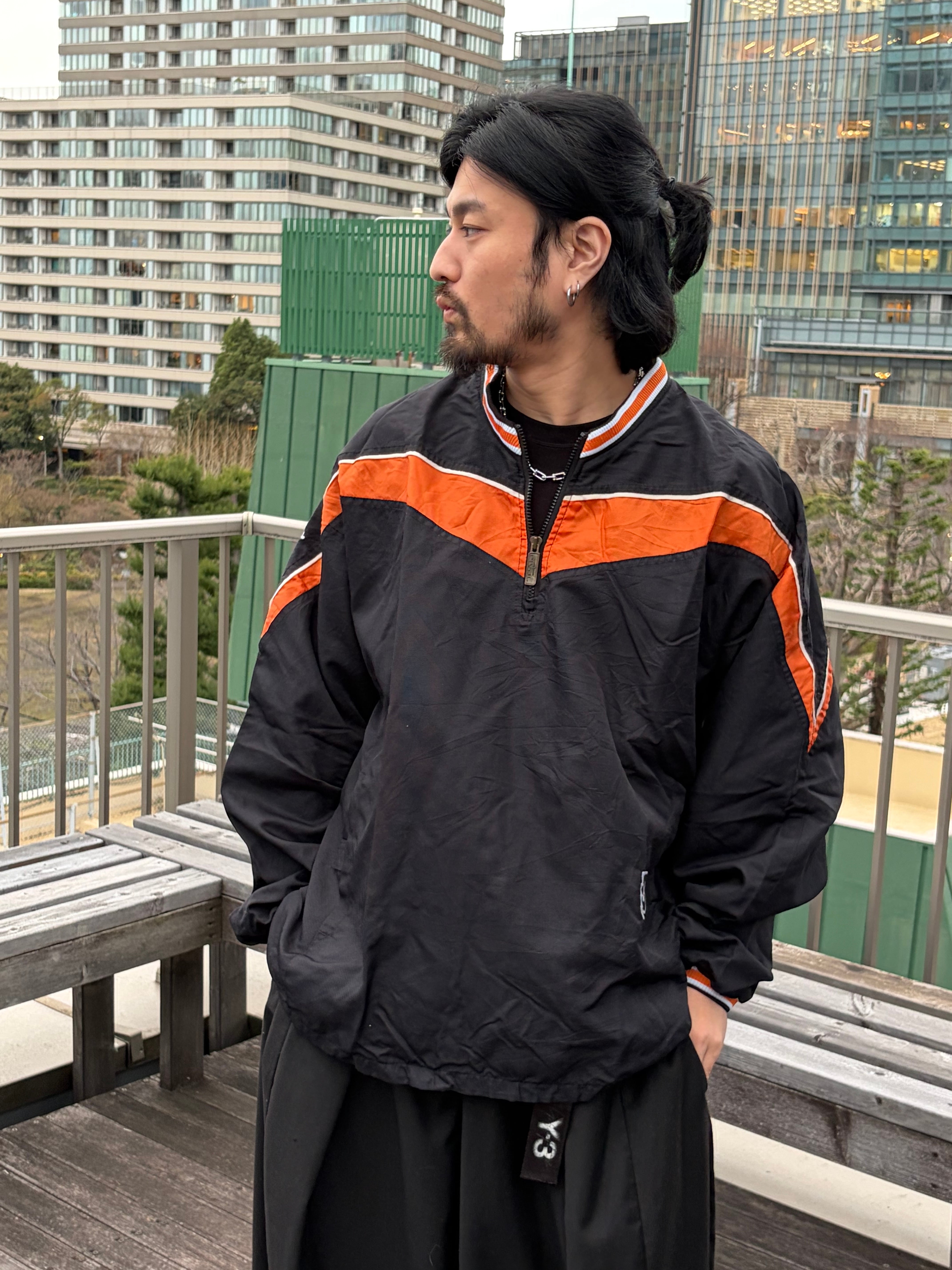 フロントのV字切り替えオレンジラインが印象的なハーフジップタイプ。