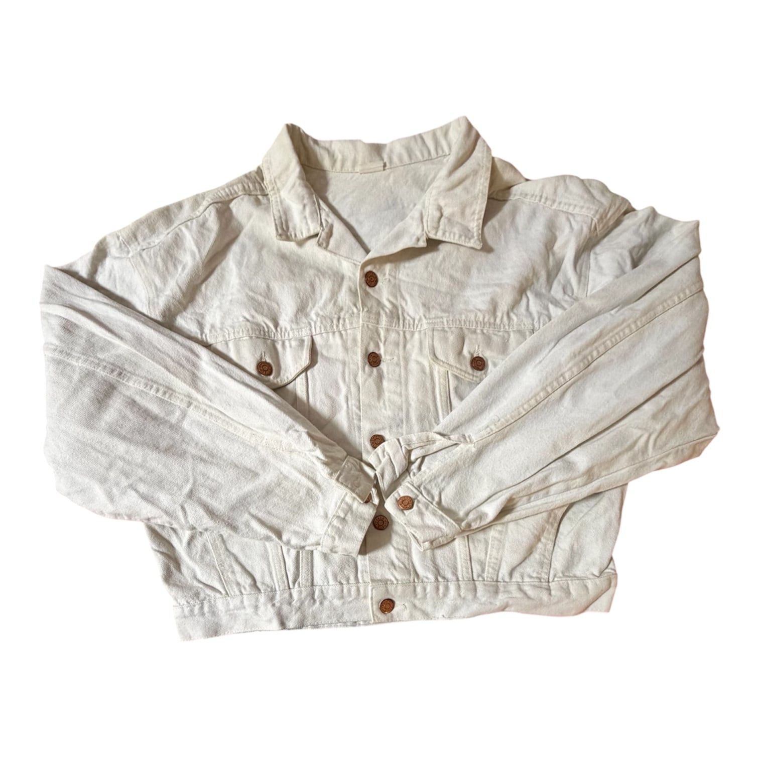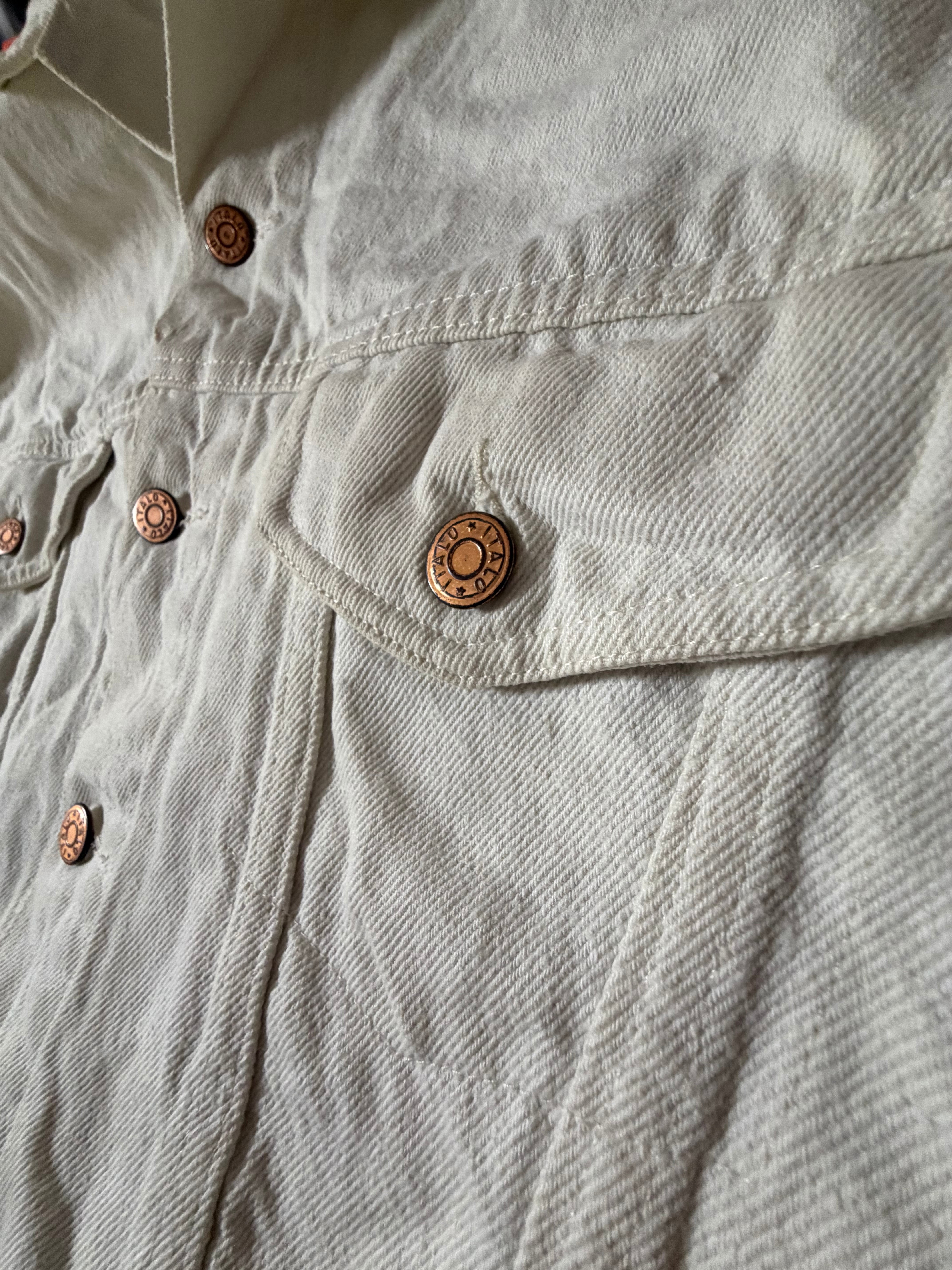 混じりけのないパキッとした「白」が目を引く、クリーンな印象のジージャンです。フロントのプリーツデザインやブラウンのボタンがアクセントになったワークテイストな一着。