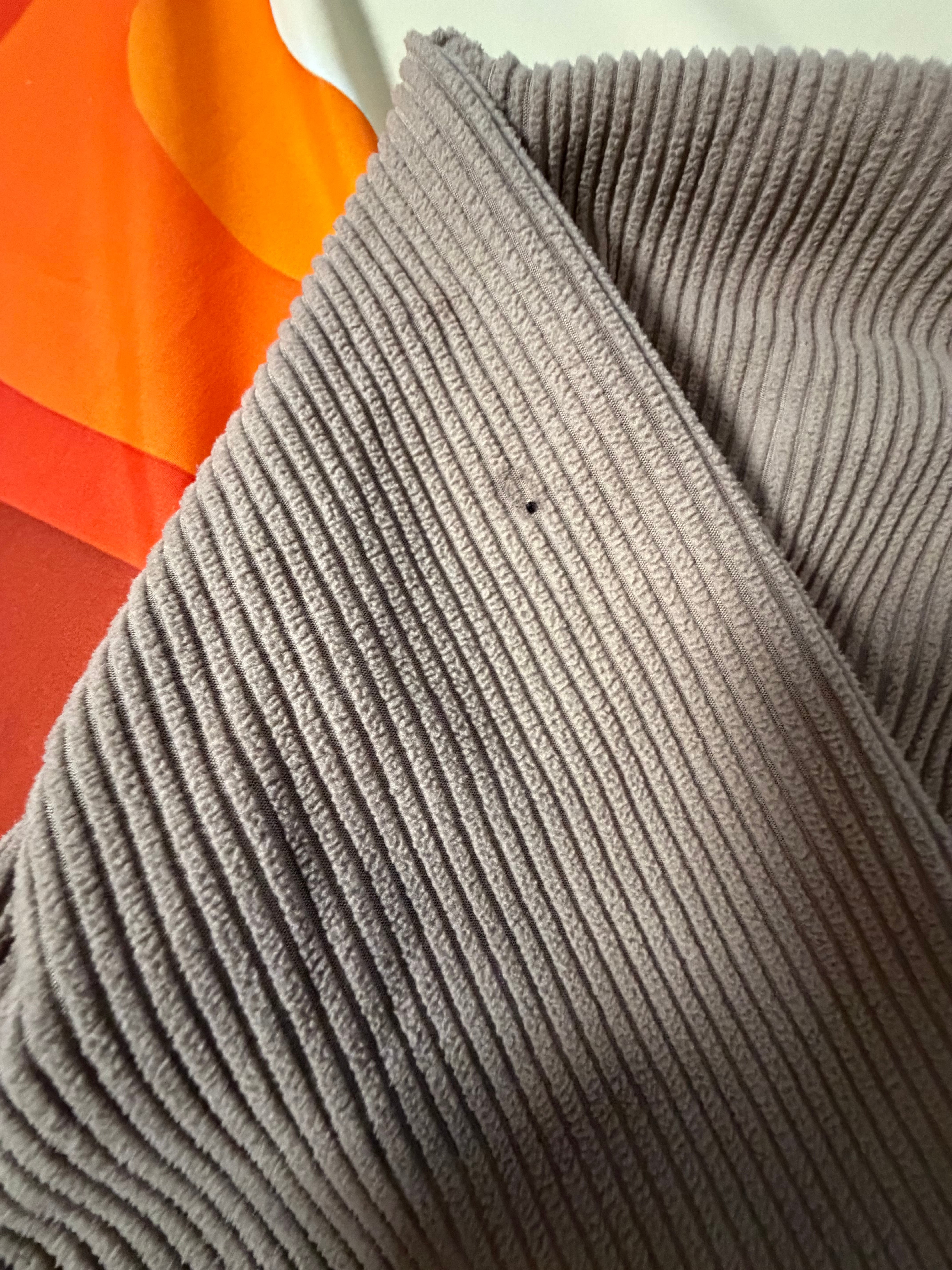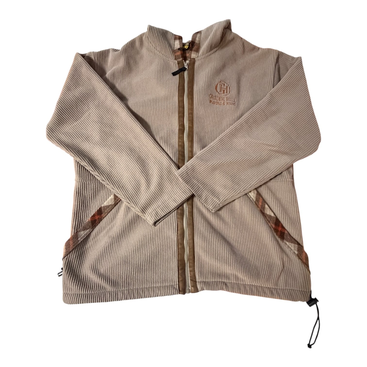 落ち着いたベージュカラーのリブ素材ジャケット。